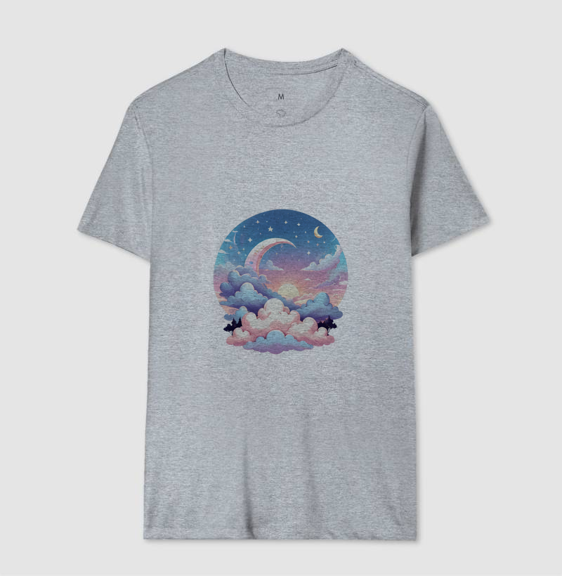Um céu dos sonhos, onde a lua derrete sua magia sobre nuvens cor-de-rosa. Essa estampa combina um crepúsculo encantado com detalhes brilhantes e um efeito surreal, criando uma peça única e cheia de mistério. Ideal para quem ama um visual místico, delicado e artisticamente fantástico. Com um toque celestial e um ar de conto de fadas, essa camiseta transforma qualquer look em uma viagem mágica pelo universo.
